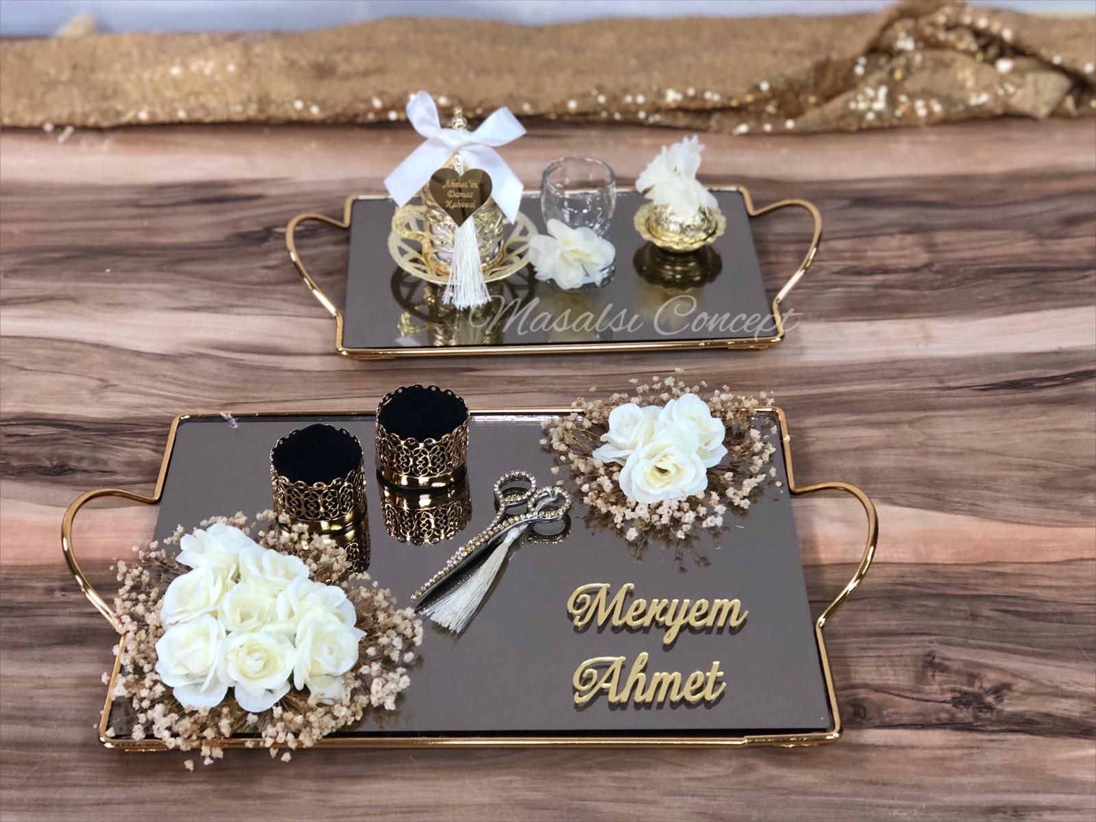 - Nişan tepsisi ve yüzükler gibi detaylar için, gelin ve damat masasına özel bir alan ayrılabilir.